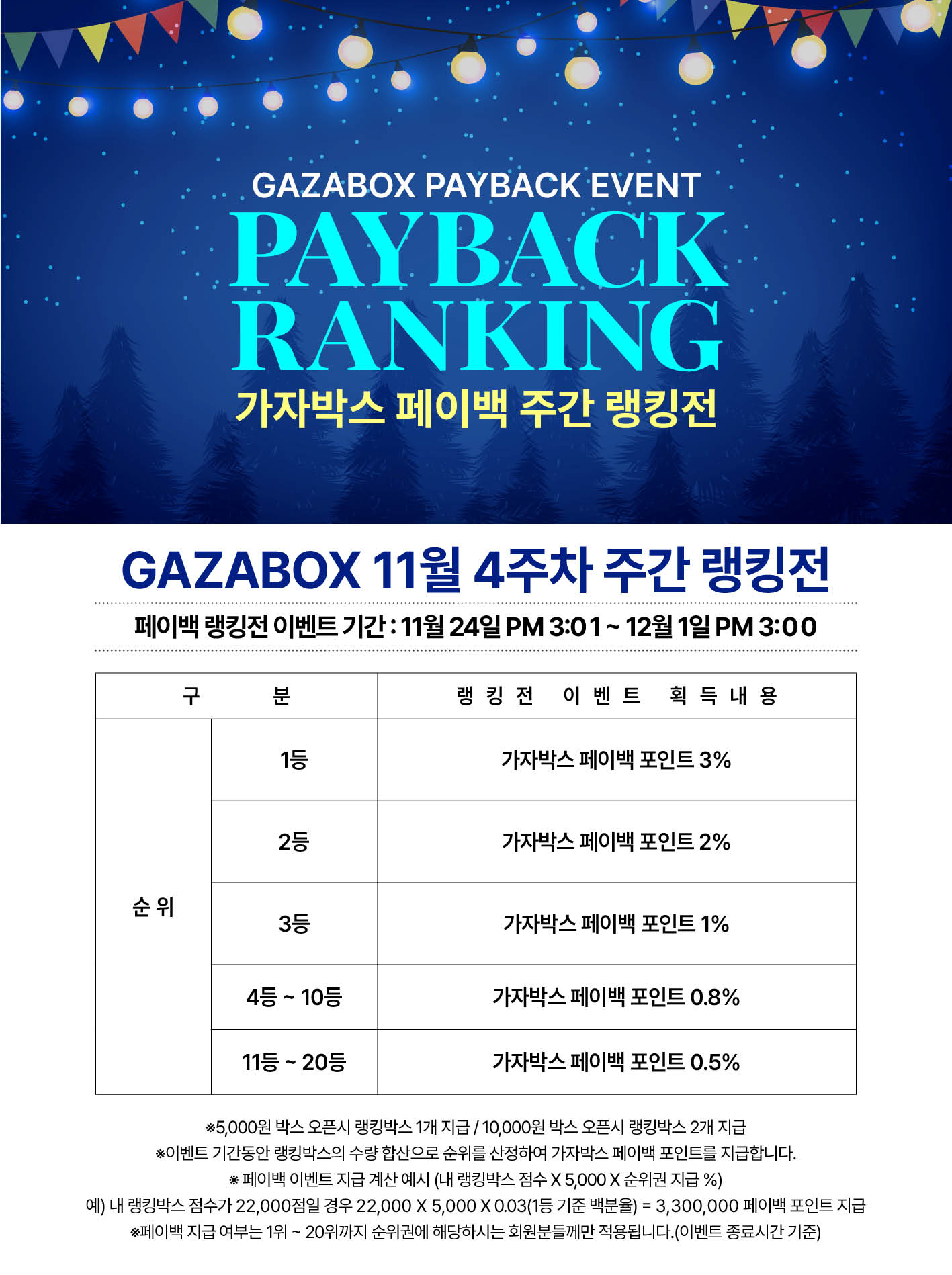 ※ 유의사항 -GAZABOX 회원만을 위한 이벤트입니다. -이벤트 당첨자는 이벤트 종료일 박스보관함을 통해 상품을 확인하실수 있습니다. -본 이벤트는 운영 상황에 따라 사전 고지 없이 변경되거나 종료될 수 있습니다. -랭킹전 진행시 회원님의 닉네임 변경을 하게되면 랭킹에 표기된 닉네임도 변경되어 표시 됩니다. 회원간의 오해가 생기지 않게 랭킹전 진행시에는 닉네임 변경을 지양하여 주세요. -개인정보의 수집 및 이용동의 *수집.이용목적 : 이벤트 경품 발송 *수집하는 개인정보 항목: (경품수령인명,휴대전화번호,경품받으실주소) *개인정보의 보유 및 이용기간 : 경품 발송후 정보 파기