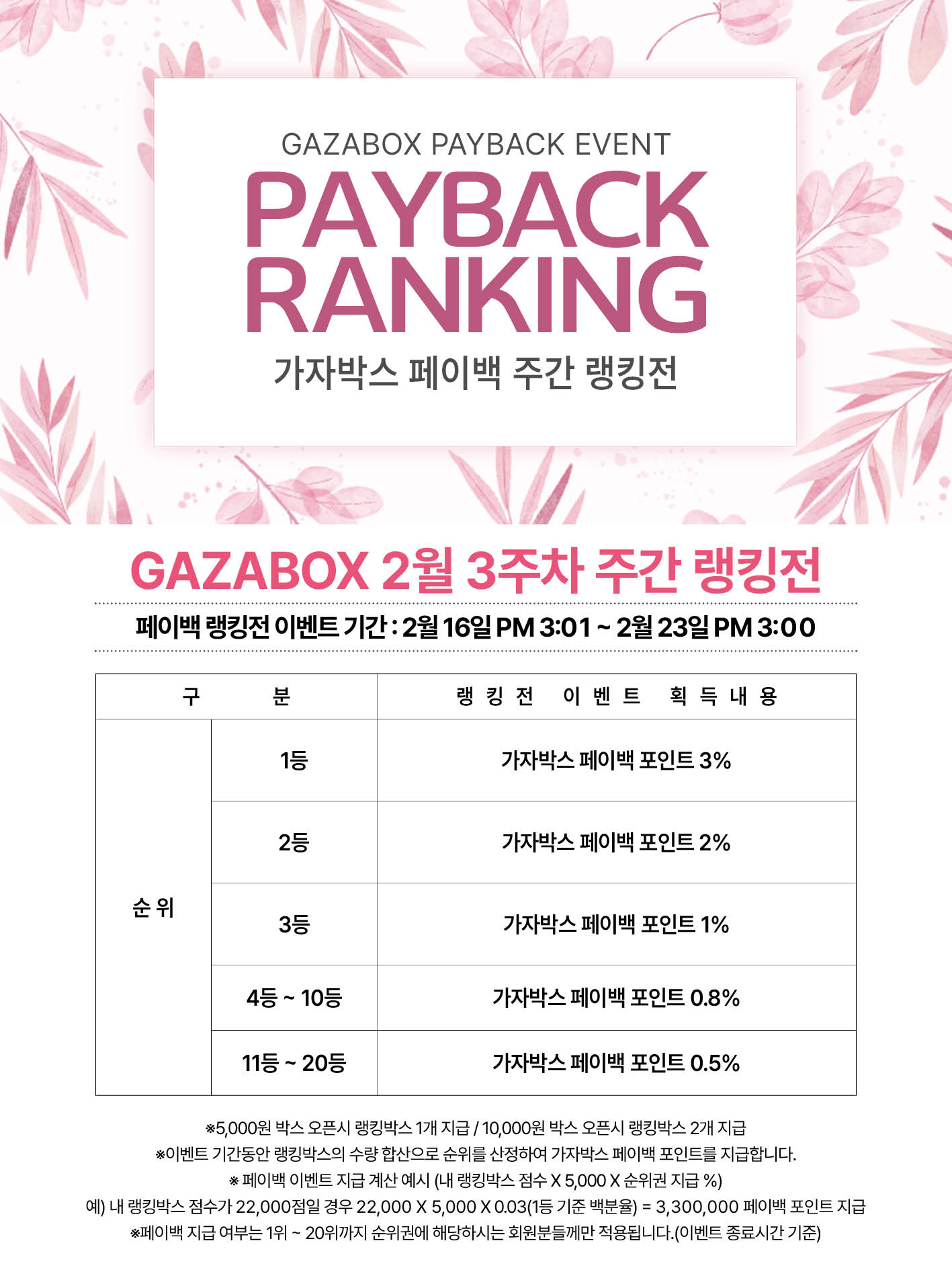 ※ 유의사항 -GAZABOX 회원만을 위한 이벤트입니다. -이벤트 당첨자는 이벤트 종료일 박스보관함을 통해 상품을 확인하실수 있습니다. -본 이벤트는 운영 상황에 따라 사전 고지 없이 변경되거나 종료될 수 있습니다. -랭킹전 진행시 회원님의 닉네임 변경을 하게되면 랭킹에 표기된 닉네임도 변경되어 표시 됩니다. 회원간의 오해가 생기지 않게 랭킹전 진행시에는 닉네임 변경을 지양하여 주세요. -개인정보의 수집 및 이용동의 *수집.이용목적 : 이벤트 경품 발송 *수집하는 개인정보 항목: (경품수령인명,휴대전화번호,경품받으실주소) *개인정보의 보유 및 이용기간 : 경품 발송후 정보 파기