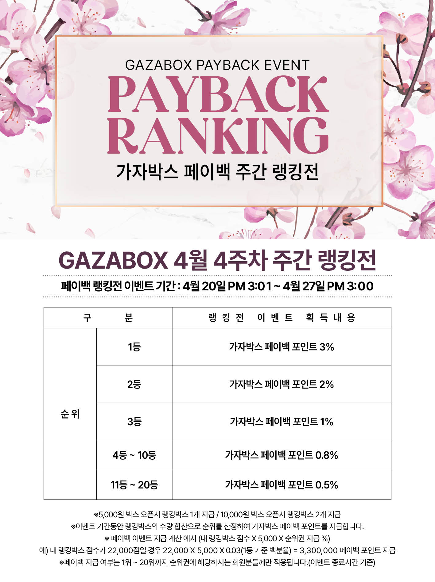 ※ 유의사항 -GAZABOX 회원만을 위한 이벤트입니다. -이벤트 당첨자는 이벤트 종료일 박스보관함을 통해 상품을 확인하실수 있습니다. -본 이벤트는 운영 상황에 따라 사전 고지 없이 변경되거나 종료될 수 있습니다. -랭킹전 진행시 회원님의 닉네임 변경을 하게되면 랭킹에 표기된 닉네임도 변경되어 표시 됩니다. 회원간의 오해가 생기지 않게 랭킹전 진행시에는 닉네임 변경을 지양하여 주세요. -개인정보의 수집 및 이용동의 *수집.이용목적 : 이벤트 경품 발송 *수집하는 개인정보 항목: (경품수령인명,휴대전화번호,경품받으실주소) *개인정보의 보유 및 이용기간 : 경품 발송후 정보 파기